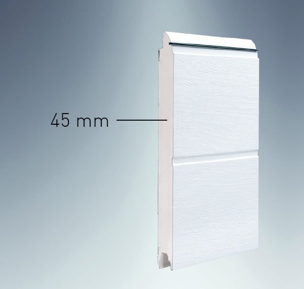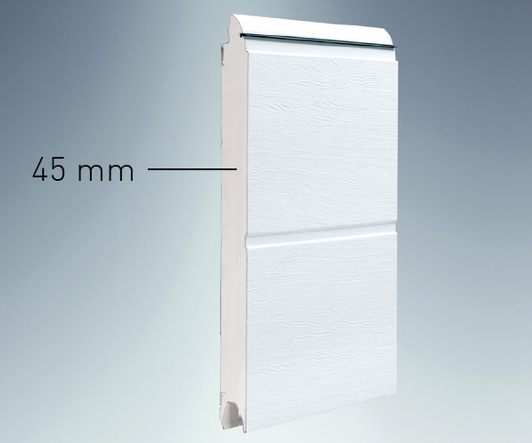 Výklopná garážová vrata jsou izolovaná a mají jádro z tuhé pěny PUR o tloušťce 45 mm pro vysokou tepelnou izolaci.