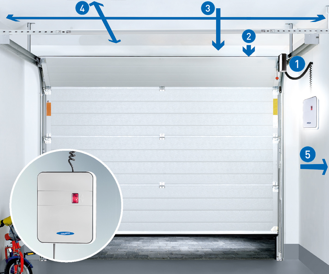Inovativní boční montáž Na rozdíl od běžných pohonů není pohon připevněn ke stropu, ale je jednoduše integrován do boční kolejnice vrat - vpravo nebo vlevo, v závislosti na stavebních podmínkách. Strop tak zůstává volný a od samého počátku odpadají překážky při instalaci.