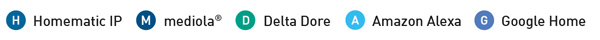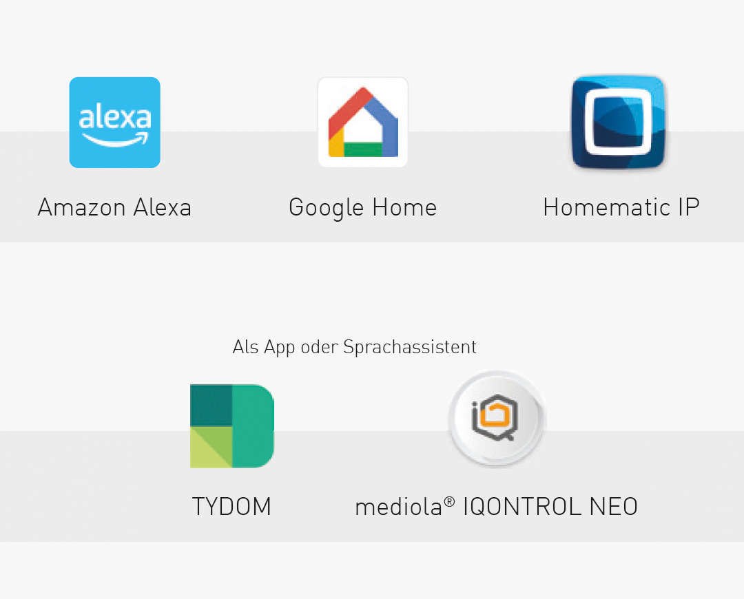 Aplikace Homematic IP od společnosti eQ-3, aplikace TYDOM od společnosti Delta Dore, IQControl Neo od společnosti mediola, Google Home a Amazon Alexa jsou k dispozici zdarma v App Store nebo Google Play.