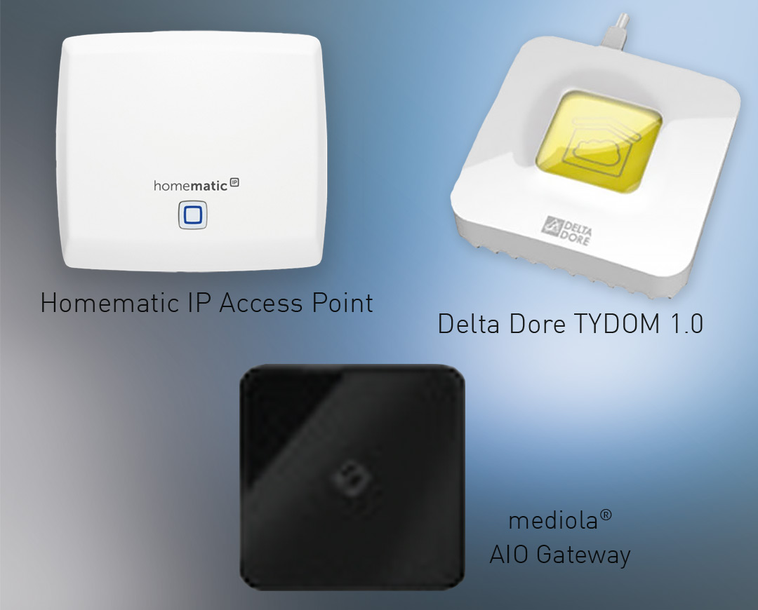 S řešením Mediola® All-in-One lze zařízení (termostat vytápění, dveřní/okenní kontakt ...) od řady výrobců SmartHome snadno spojit do systému SmartHome, automatizovat a ovládat pomocí aplikace Mediola®.
