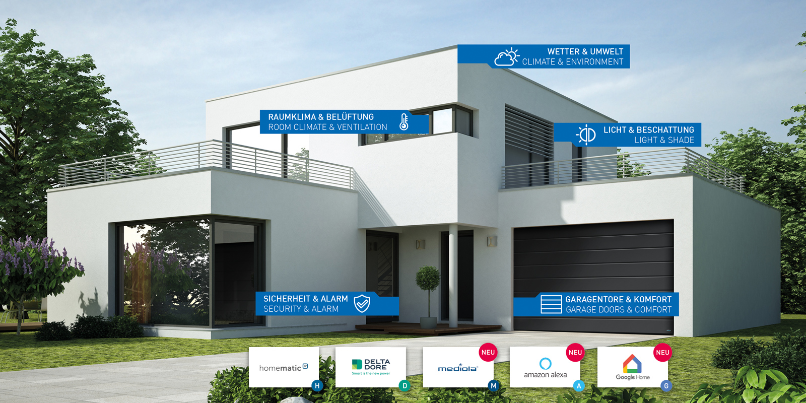 Pro inteligentní ovládání garážových vrat od společnosti Novoferm (NovoPort®, Novomatic 443, Novomatic Speed 573 S) můžete použít typické systémy SmartHome (Homematic IP, DeltaDore, Mediola, Google Home, Amazon Alexa).