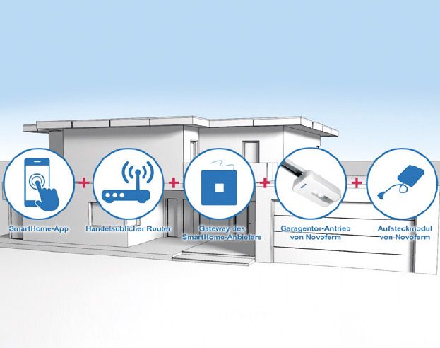 Stávající systém SmartHome není podmínkou pro použití aplikace nebo hlasového ovládání sekčních garážových vrat. K ovládání sekčních garážových vrat nebo pohonů Novoferm prostřednictvím aplikace nebo hlasového příkazu stačí nastavit zásuvný modul Novoferm nebo modul WiFi, standardní router a případně řídicí centrum SmartHome požadovaného systému SmartHome. Každý, kdo teprve uvažuje o tom, že si svůj domov udělá "chytrý", může udělat první krok se systémem ovládání garážových vrat.