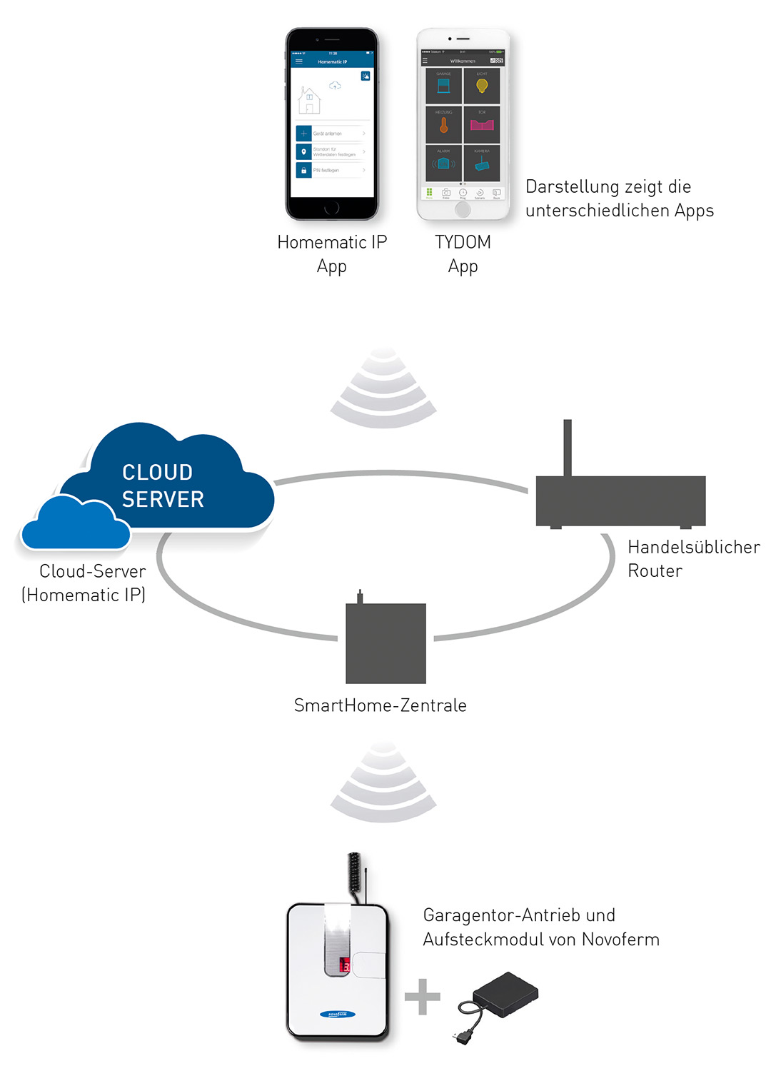 Ve spojení s modulem Novoferm Wifi komunikují prvky SmartHome z cloudu do cloudu přes Wifi pomocí standardního routeru na internetu.