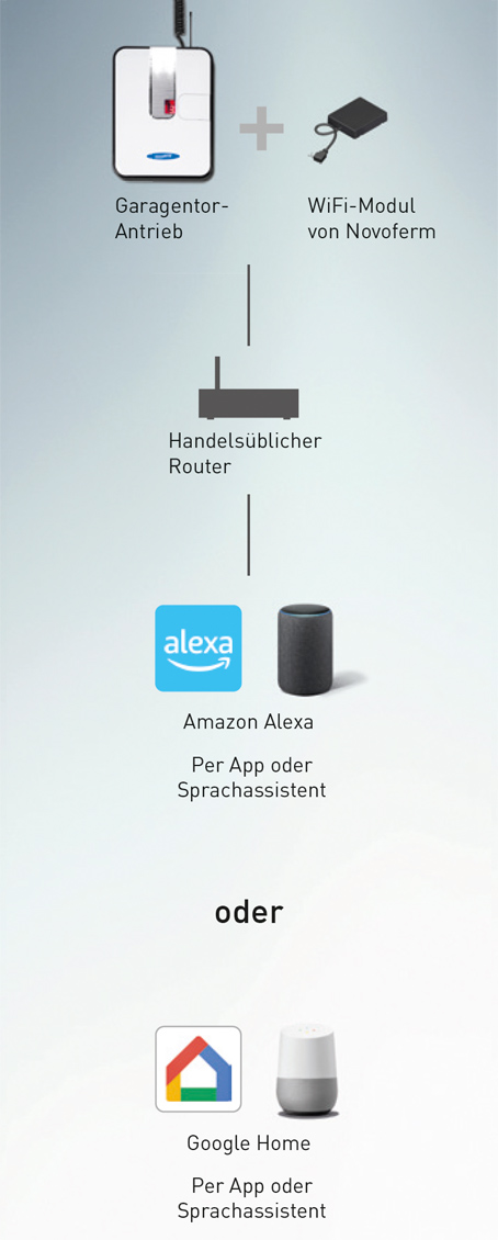Se systémy Amazon Alexa a Google Home můžete nyní ovládat svá sekční garážová vrata Novoferm ještě pohodlněji pomocí hlasového ovládání. I když již máte systém SmartHome od jiného poskytovatele, můžete do něj integrovat Alexu nebo Google.