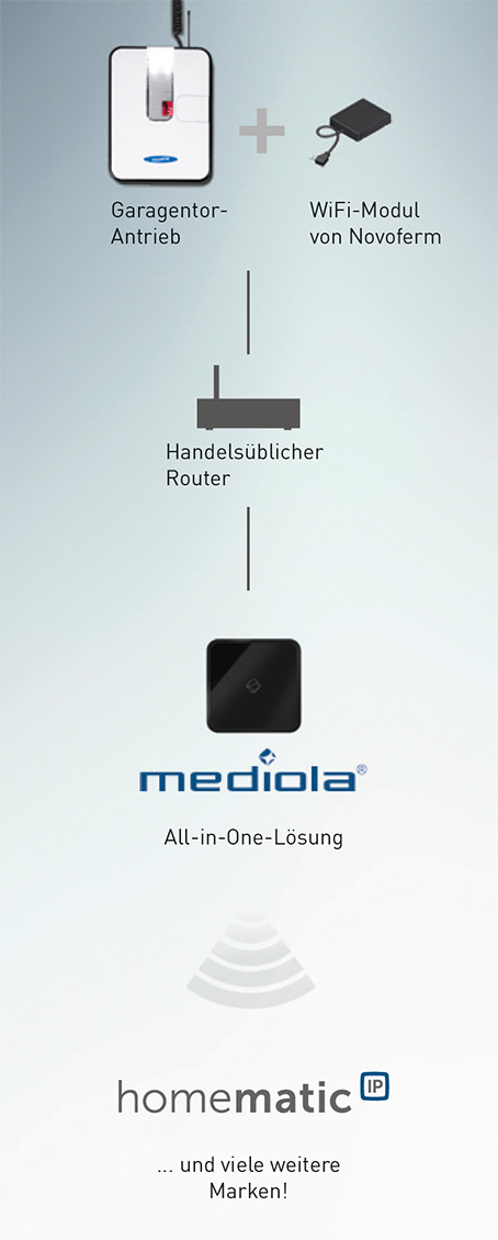 K integraci sekčních garážových vrat Novoferm do systému Mediola® SmartHome stačí pouze nový modul Novoferm WiFi nebo modul Novoferm Homematic IP.