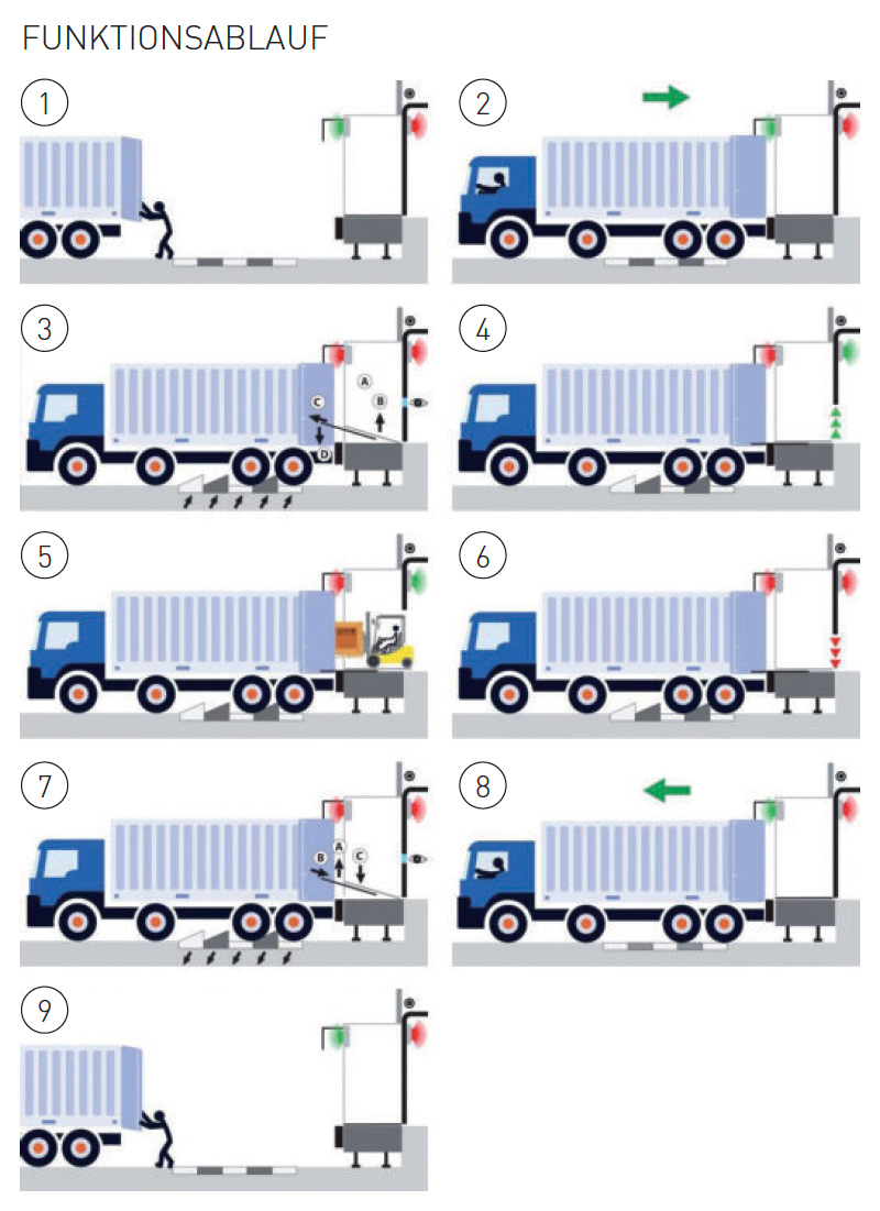 Proto se používají elektronické klíny na kola s připojením k bráně a nakládacímu mostu. Nakladač lze ovládat pouze tehdy, když je klín kola v kontaktu s kolem. Správné použití zajišťuje snímač polohy v klínu kol.