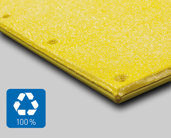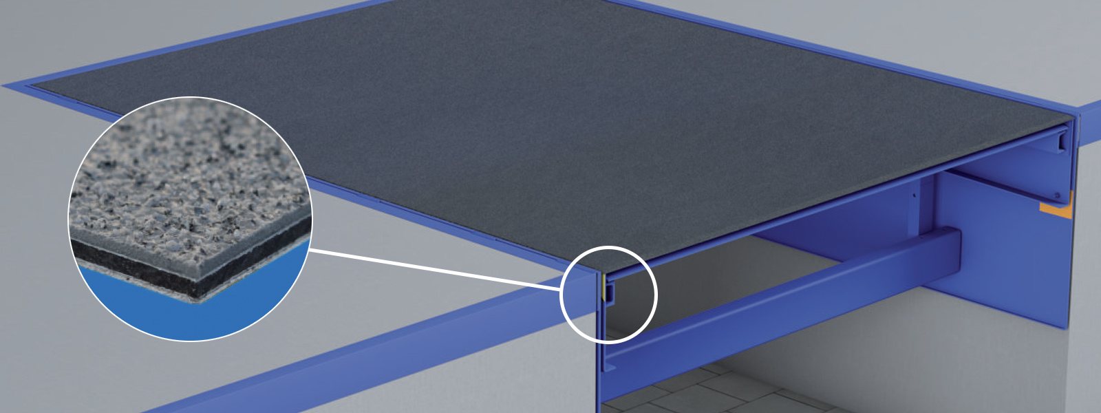 | - Masivní snížení hluku až o 85 % (25 dB) pro zvýšení bezpečnosti práce, testováno TÜV Rheinland. | - Vysoká odolnost proti uklouznutí (R12), testováno asociací pojištění odpovědnosti zaměstnavatelů podle DIN |