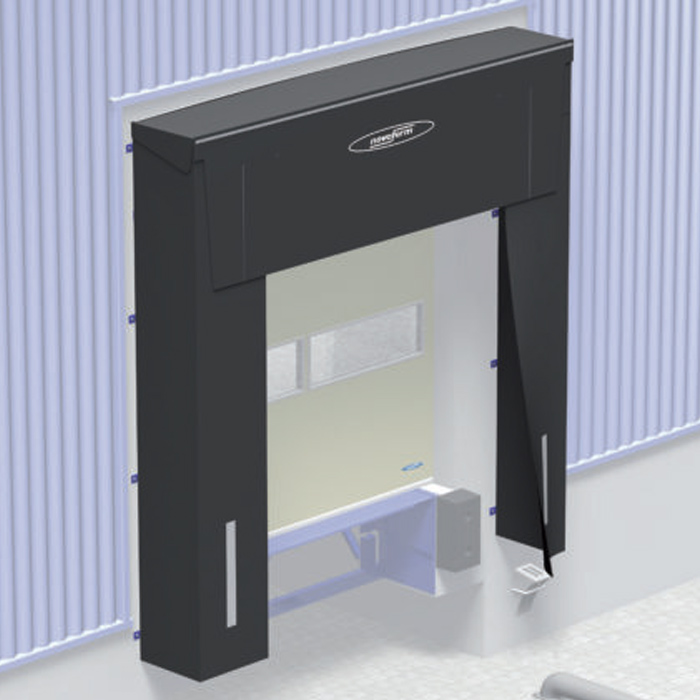 Pružné těsnění dveříz hliníku Přístřešky Novoferm s odpruženou přední částí chrání před průvanem, deštěm a větrem. Vytvářejí dokonalé těsnění mezi nákladním vozem a budovou a zabraňují ztrátám energie a případnému poškození nákladu.