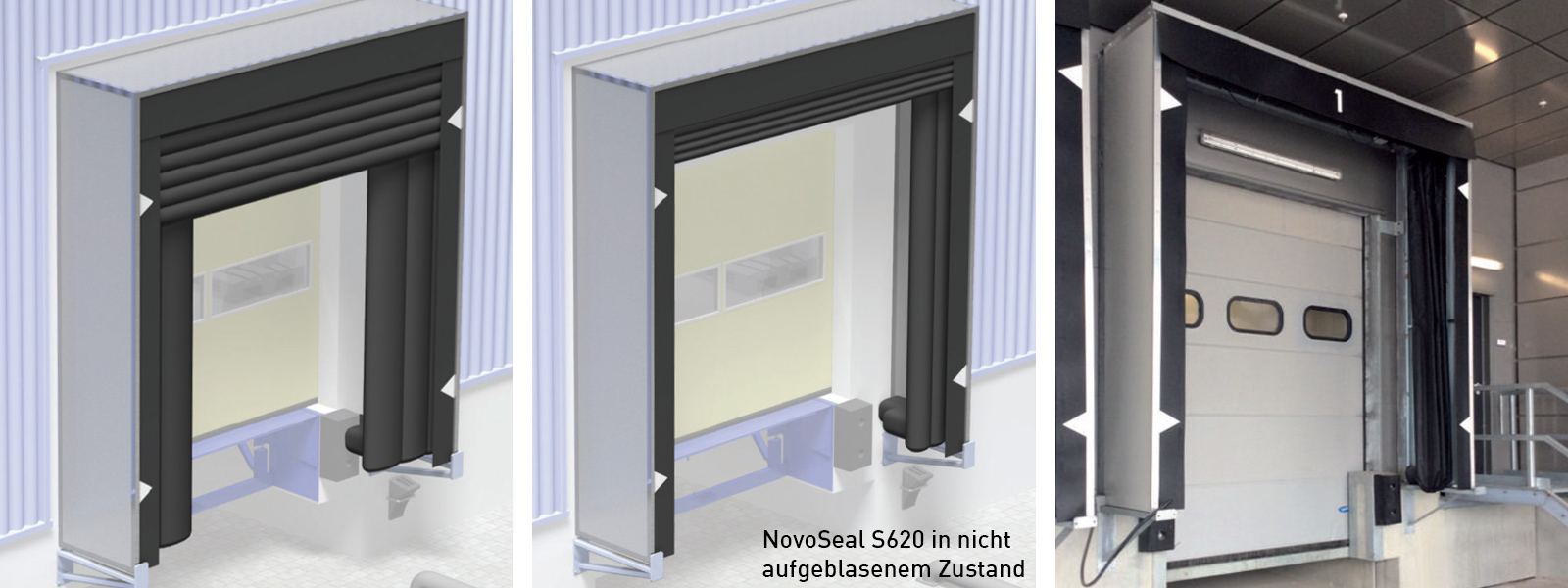 NEPŘEHLÉDNUTELNÉ TĚSNĚNÍ DVEŘÍ S MODULÁRNÍ KONSTRUKCÍ V rámci integrovaného řešení nakládky se NovoSeal S620 automaticky aktivuje postupně v kombinaci s kombinovanou řídicí jednotkou Novo i-Vision. Po stisknutí tlačítka pro otevření dveří se nejprve nafoukne měch S620 a poté se dveře automaticky otevřou. Jakmile je proces nakládání dokončen, funkce AutoDock nejprve přesune dokovací zařízení do klidové polohy, poté zavře dveře, vypne všechna připojená nakládací světla, odvzdušní S620 a přepne externí světelnou signalizaci na zelenou.
