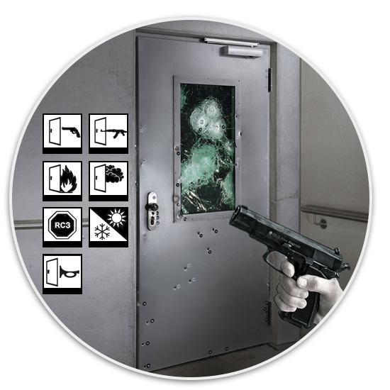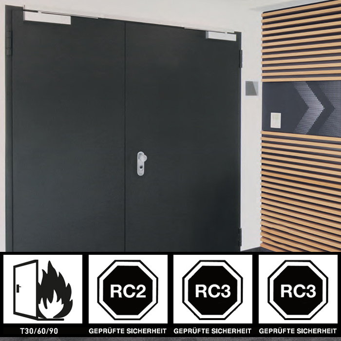 Ocelové bezpečnostní dveře s testovaným zabezpečením podle RC 2 (WK 2), RC 3 (WK 3) a RC 4 (WK 4) lze v závislosti na provedení kombinovat s třídou požární ochrany EI 30 (T30), EI 60 (T60) a EI 90 (T90).