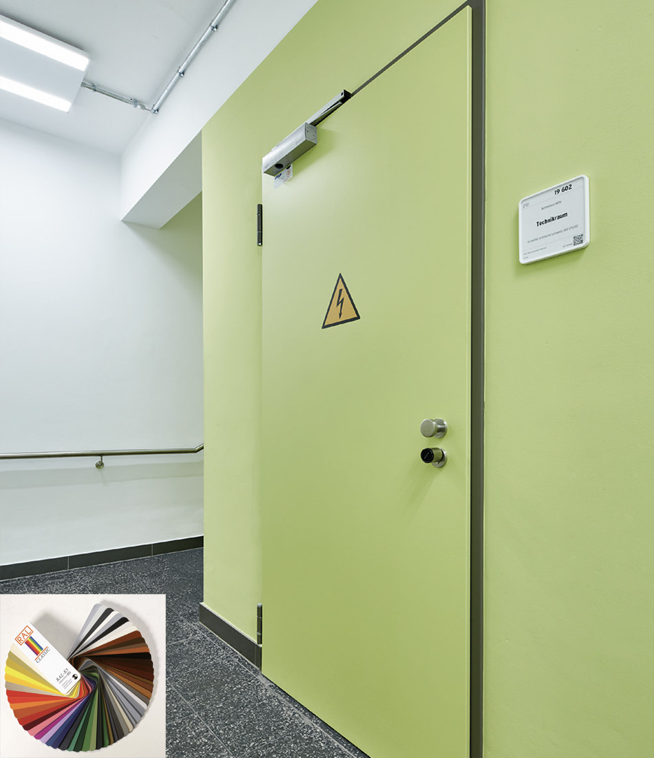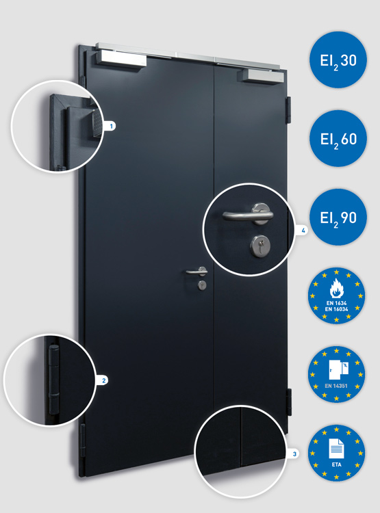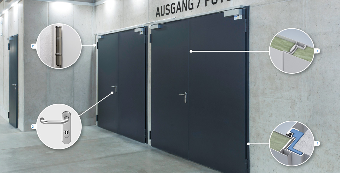 - K dispozici v protipožárních třídách ochrany EI 30, EI 60 nebo EI 90 a také jako kouřotěsné, víceúčelové, zvukově izolační a bezpečnostní dveře.