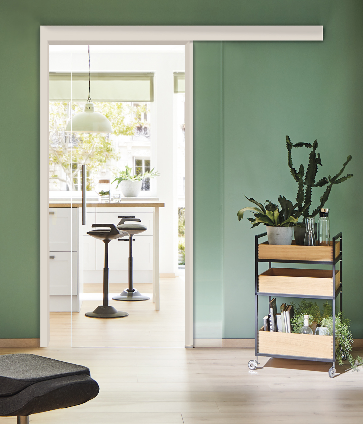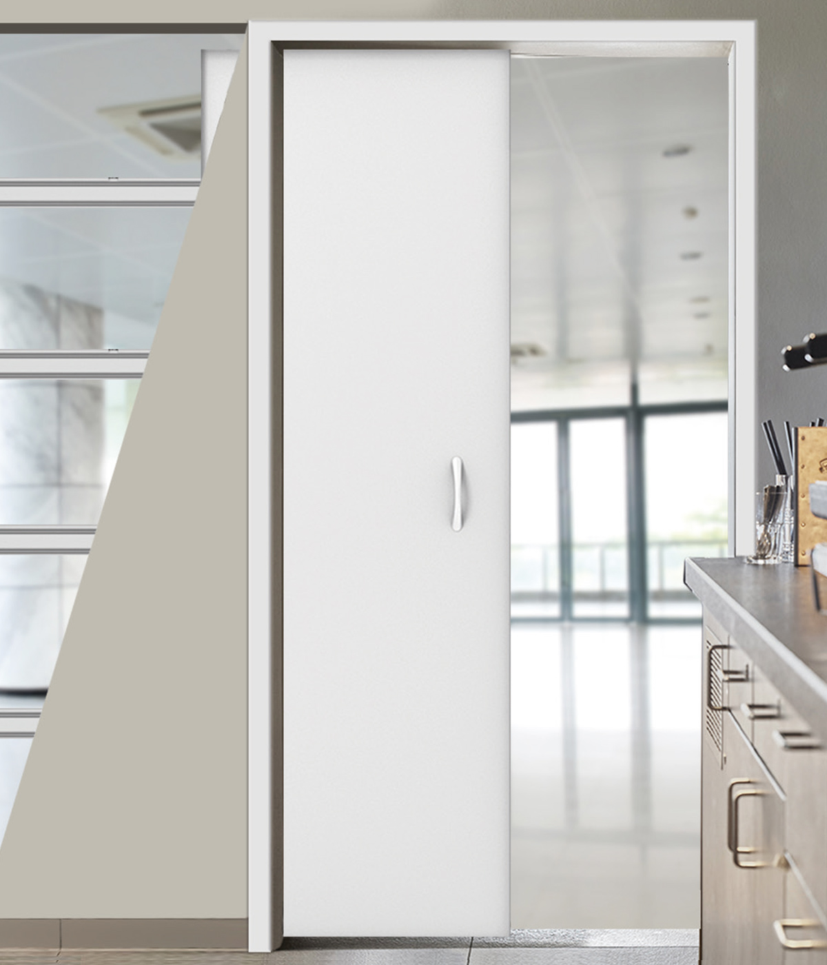 NovoSlide Pocket, systém posuvných dveří, který se v demontovaném stavu zasouvá do stěny jako nástěnná skříňka.