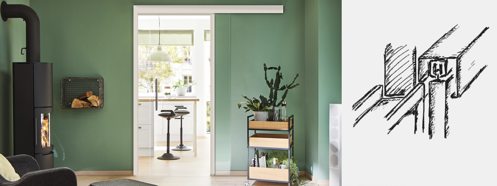 Systém posuvných dveří NovoSlide Pocket obsahuje všechny komponenty, které potřebujete k vytvoření posuvných dveří vedených ve zdi.