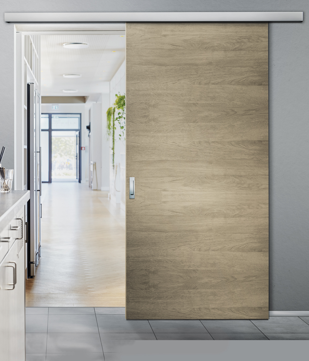 Systém posuvných dveří NovoSlide Wall obsahuje všechny komponenty, které potřebujete k instalaci posuvných dveří před stěnu, včetně pojezdové dráhy a krycího panelu a sady válečků s tlumením na obou stranách pro měkké zavírání dveří.