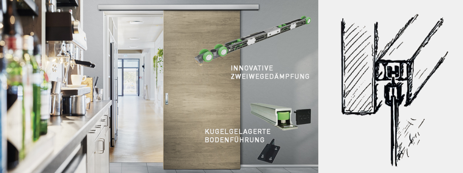 Sada vozíku vždy obsahuje oboustranné tlumení do hmotnosti dveřního křídla 80 kg pro šířku dveřního křídla od 610 mm. Parkovací polohy vrat se dosáhne jednoduchým umístěním aktivátorů v pojezdové dráze a lze ji také dodatečně namontovat. Integrované metrové značky na všech podélných profilech usnadňují přizpůsobení hotové podlaze.