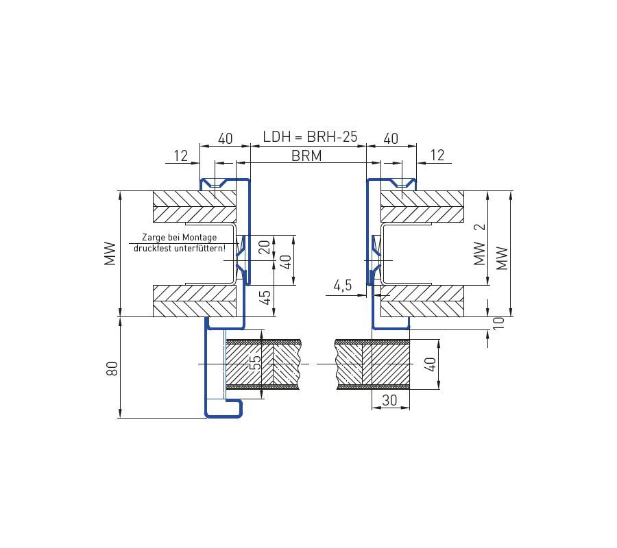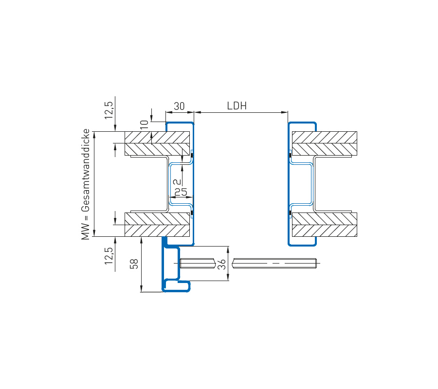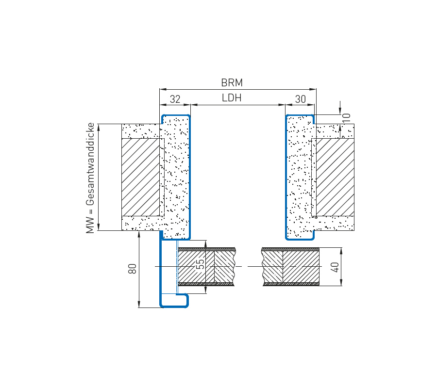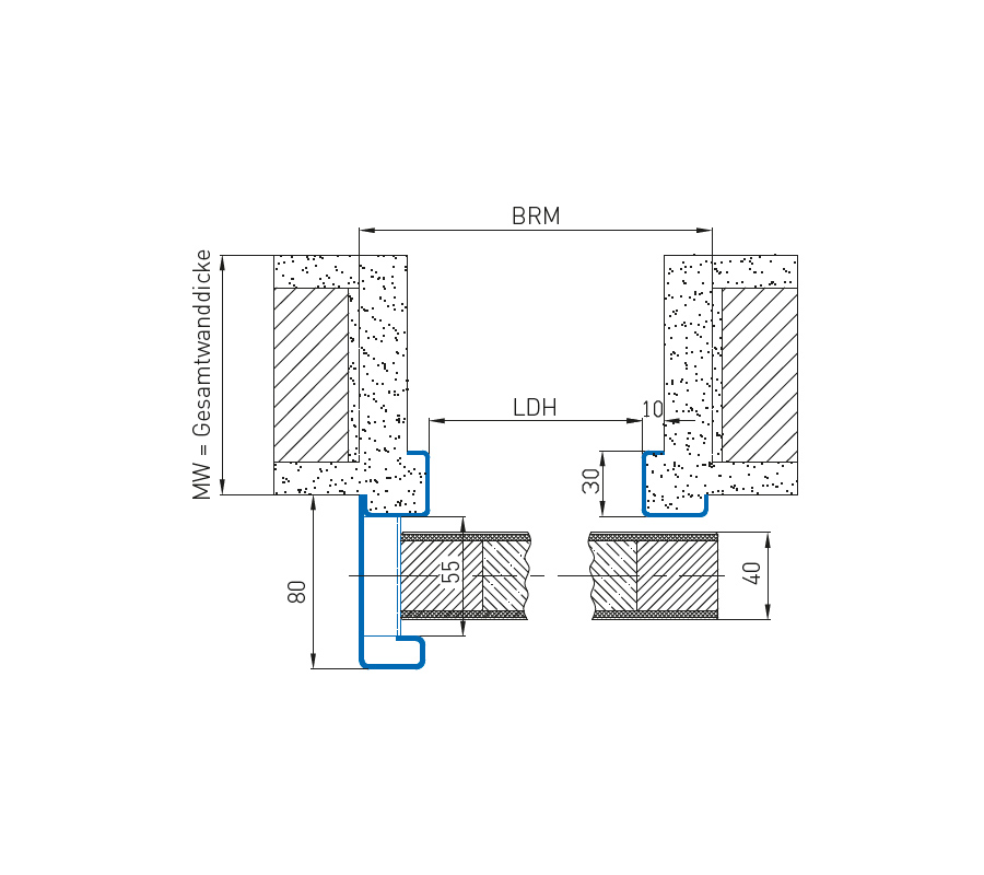 - Obvodový rám s dorazovým sloupkem, jednoplášťový pro plnou stěnu nebo doprovodnou montáž do suché stěny nebo dvouplášťový pro následnou montáž do suché stěny nebo zdiva