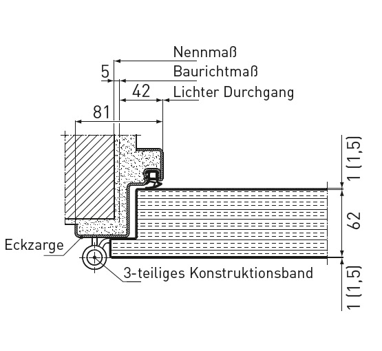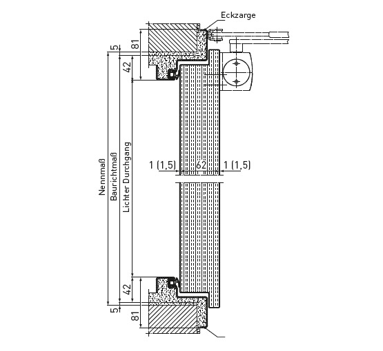 Kování: Standardně jeden 3dílný konstrukční závěs s kuličkovým ložiskem a jeden 3dílný pružinový závěs. Závěsy standardně opatřené základním nátěrem v bílé barvě podobné RAL 9016; na přání jsou k dispozici také v nerezové oceli. Třídílné nastavitelné závěsy z oceli a nerezové oceli jsou k dispozici pouze od výšky BRM > 1 000 mm (LD > 916 mm). Tyto rozměrové řady jsou zahrnuty v příslušných hlavních produktových stránkáchEI2 30 a EI2 90. Jeden zajišťovací čep na každé křídlo klapky. Výměnný profilový cylindrický zámek s černou kulatou pákovou sadou uloženou na pevném otočném ložisku. Profilová cylindrická vložka pro vnitřní klapky na místě (délka 85 mm, 35/50 mm). Součástí dodávky pro vnější klapky ve formě atrapy cylindrické vložky. Standardně klapky s vnitřní výztuhou pro horní zavírač dveří na straně závěsu.