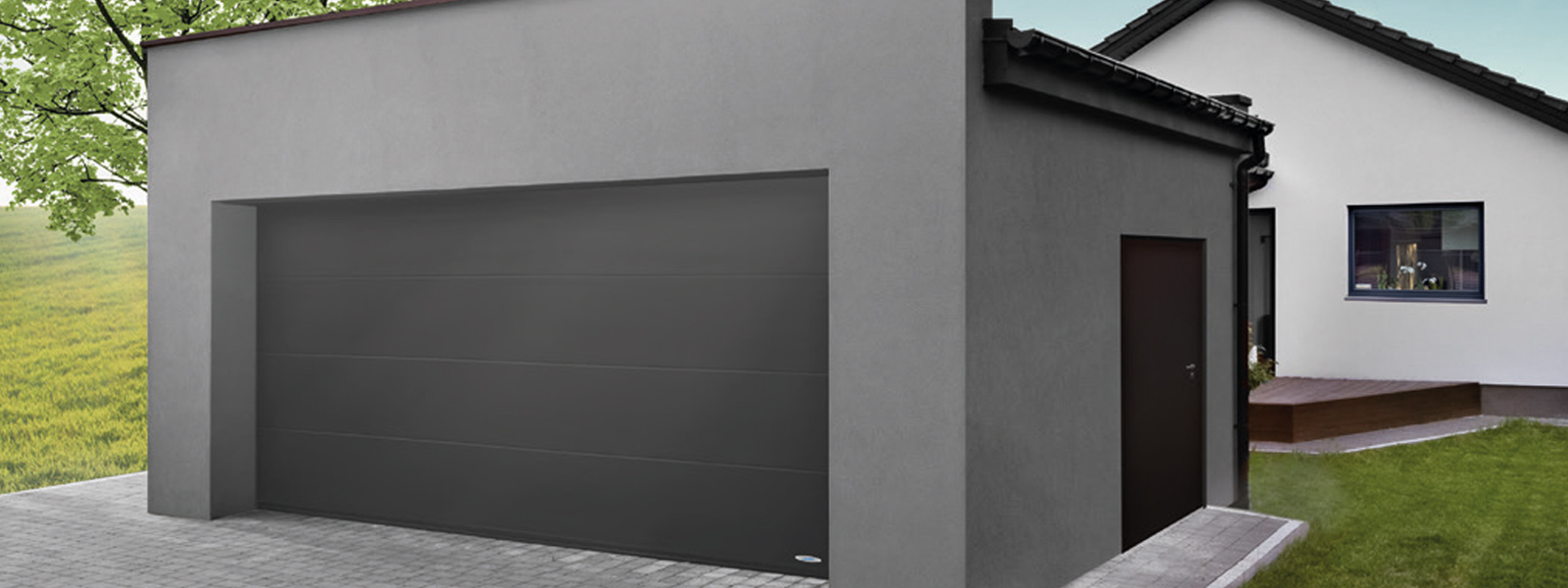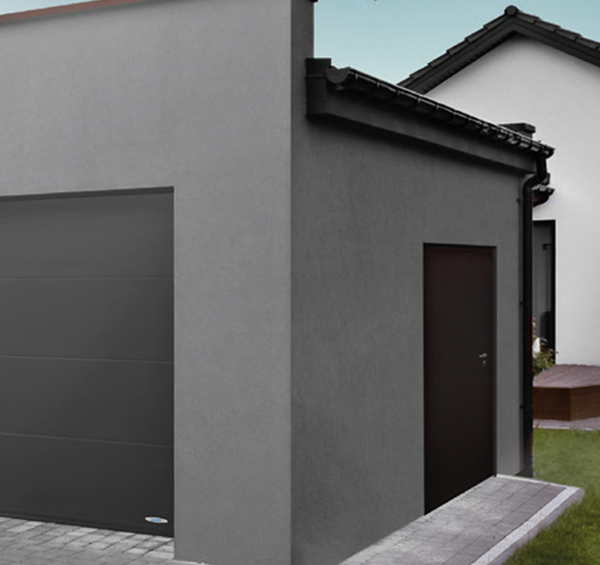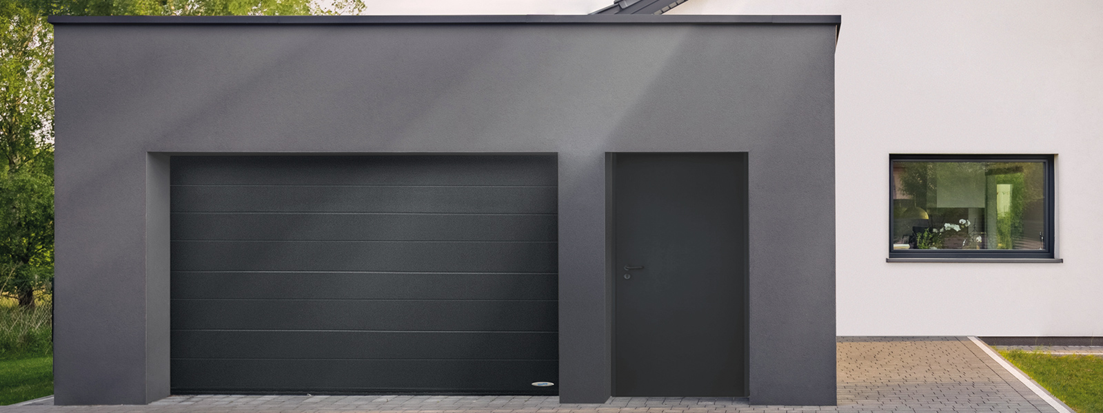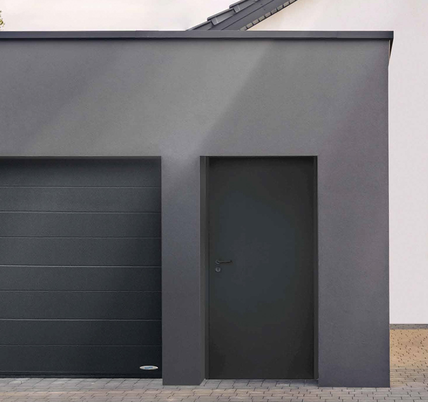 Jako boční dveře do garáže nebo dveře pro boční vjezd do garáže v antracitově šedé barvě podobné RAL 7016.