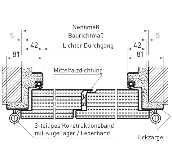 Dveře 2-křídlé | Silný falc 1,0 | - | do RC 3 | 37 dB1) 40 dB2) | 1,6 | max. 3000 x 3000 jako typ MZ53-2 až 3000 x 3500 |