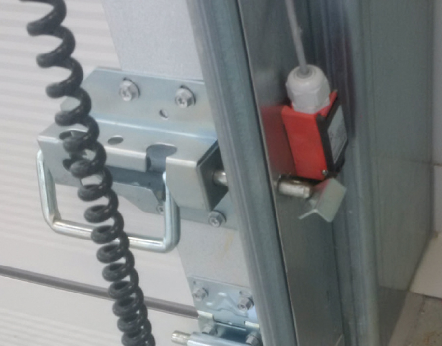 Tlačítko se zablokuje v kolejnici, takže vrata již nelze otevřít, a mikrospínač deaktivuje funkci pohonu.