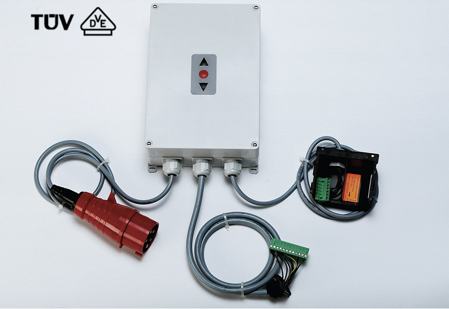 Nouzová ruční klika nebo rychloupínací ruční řetěz pro ruční ovládání v případě výpadku proudu. Všechny elektrické přípojky na pohonu lze zapojit do zásuvky. Provozní napětí 400 V třífázový proud.