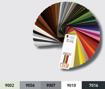 Křídlo vrat lze volitelně opatřit továrně nanesenou povrchovou úpravou v níže uvedených barvách RAL. Přesná barva povrchové úpravy se může mírně lišit. Ocelové a hliníkové profily jsou k dispozici také lakované podle vzorníku RAL (kromě fluorescenčních a dopravních barev).
