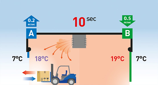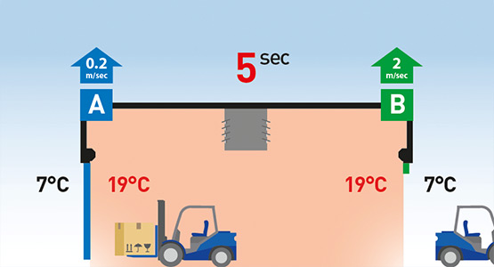 Následující obrázek ukazuje, jak se ztrácí energie prouděním vzduchu v běžných dveřích [A], zatímco SpeedRoller od společnosti Novoferm [B] se opět zavře dříve, než k takovému proudění vzduchu dojde.