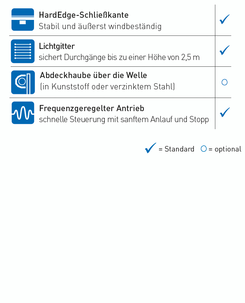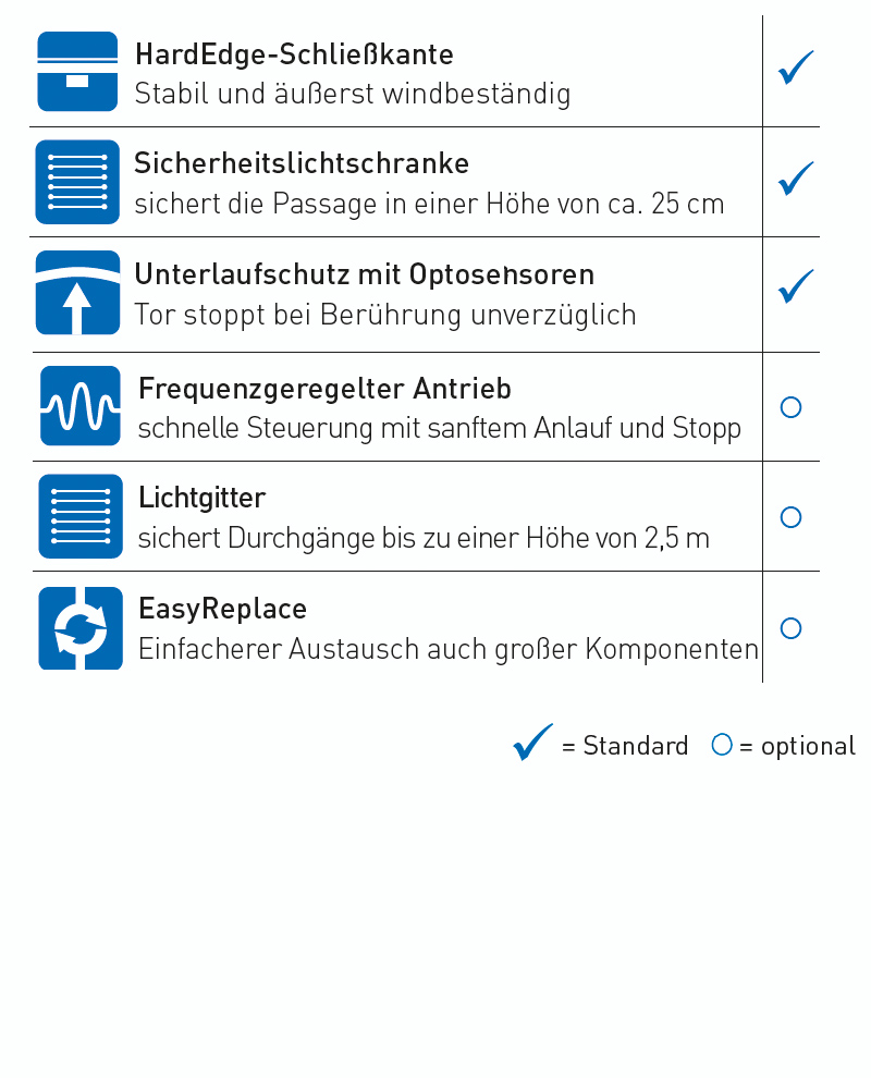 Bezpečnost | Světelná mříž: Zabezpečení celého průchodu až do výšky 2 500 mm. | o | o | o | o |