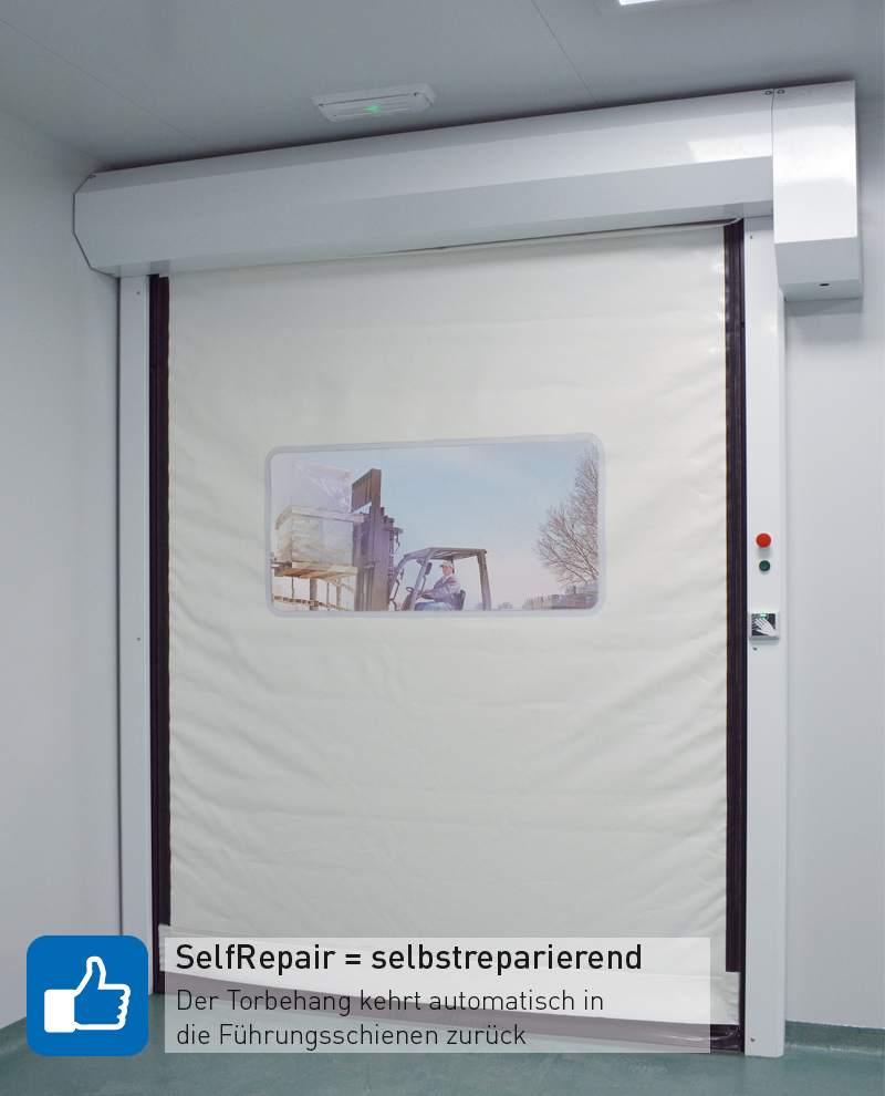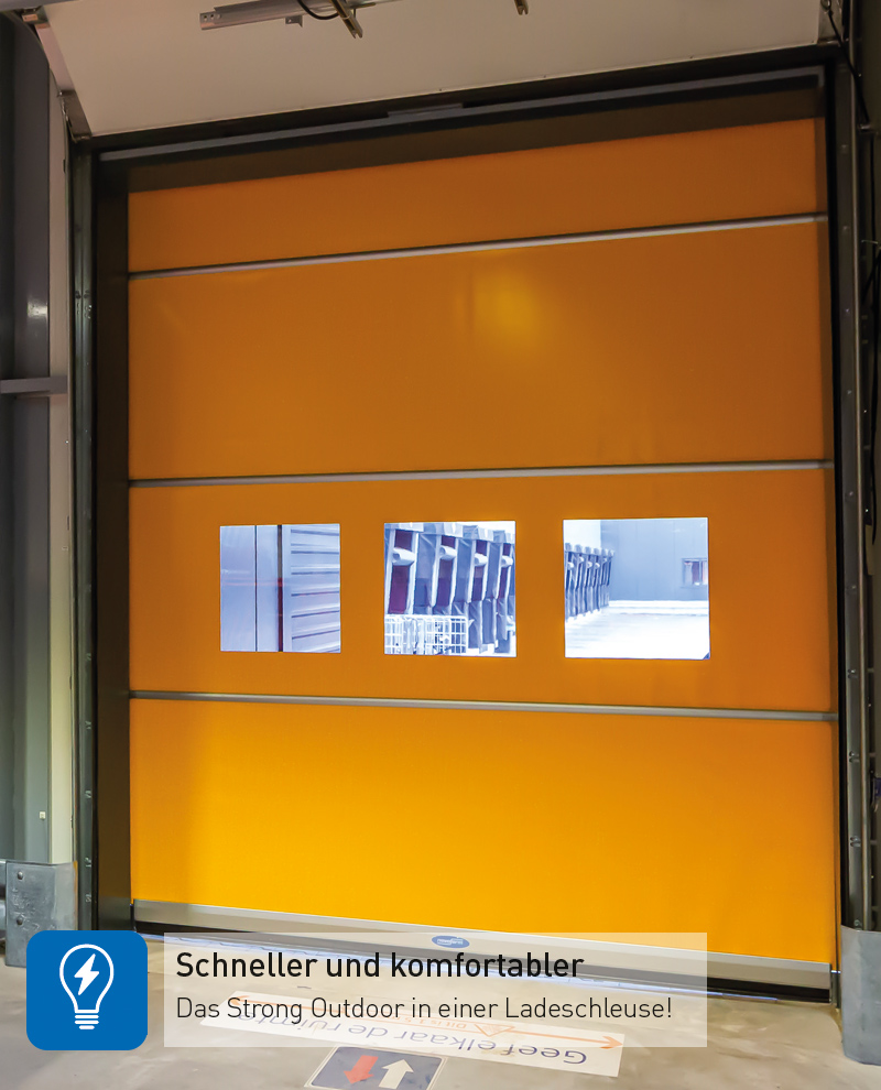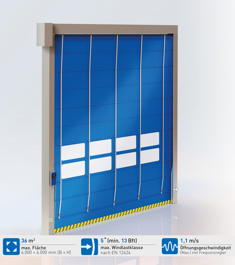 Vrata NOVOZIP jsou extrémně rychlá, mimořádně spolehlivá i při velkém zatížení větrem a navíc se sama opravují: Po kolizi s vraty se clona automaticky vrátí na vodicí lištu. Tím se prakticky eliminuje přerušení výrobního procesu.