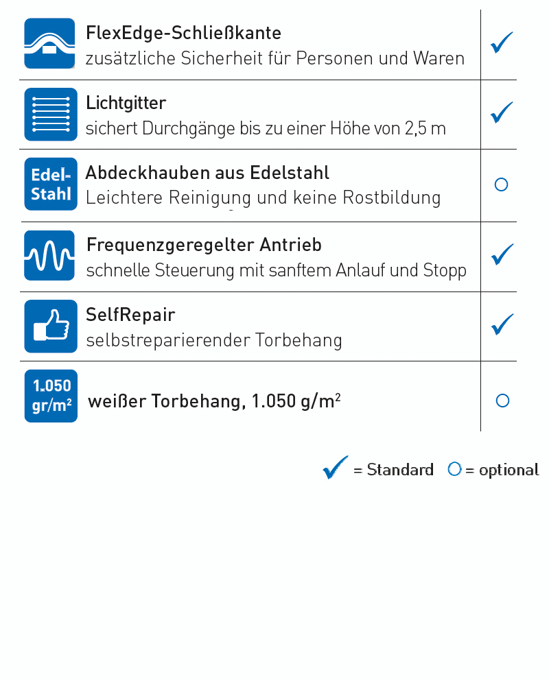 Závěs NOVOZIP je extrémně rychlý, mimořádně spolehlivý i při velkém zatížení větrem a je také samoopravný: po kolizi s vraty se závěs automaticky vrátí na vodicí lištu. Tím se prakticky eliminuje přerušení výrobního procesu. Zároveň ušetříte mnoho energie a můžete zajistit trvale příjemné klima v interiéru.