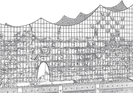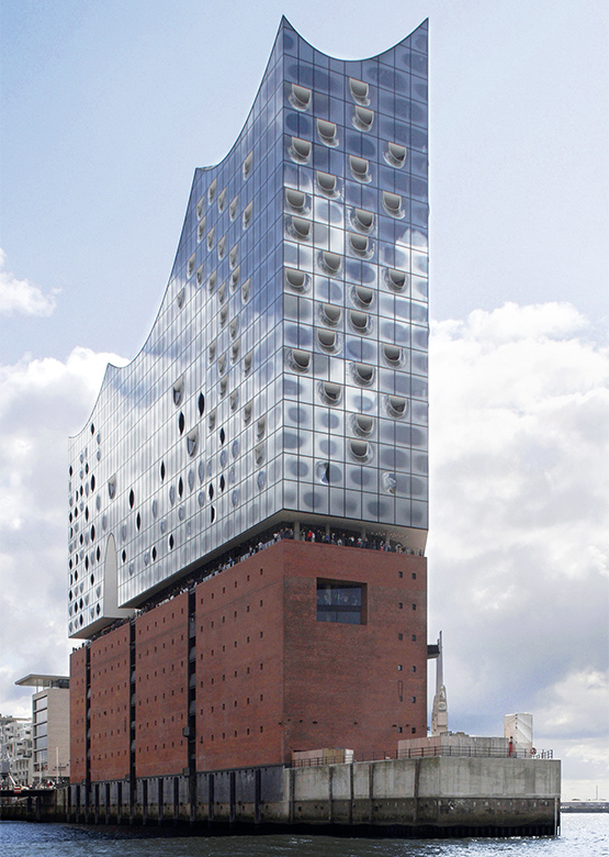 Na zářivost Elbphilharmonie je snadné zapomenout, ale tato budova prošla velmi rozsáhlou rekonstrukcí. Původní Kaiserspeicher nyní tvoří 37 metrů vysokou základnu, na níž se nachází pozoruhodná střešní krajina ze skla a oceli navržená basilejskými architekty Herzog & de Meuron. Tím se dostupná podlahová plocha zvětšila na 120 000metrů čtverečních, což samozřejmě zahrnuje mnohem více než jen koncertní sál a jeho okrajové části. Součástí Elbphilharmonie je také pětihvězdičkový hotel s 244 lůžky a na jejím západním konci 45 exkluzivních bytových domů rozmístěných v 17 patrech.