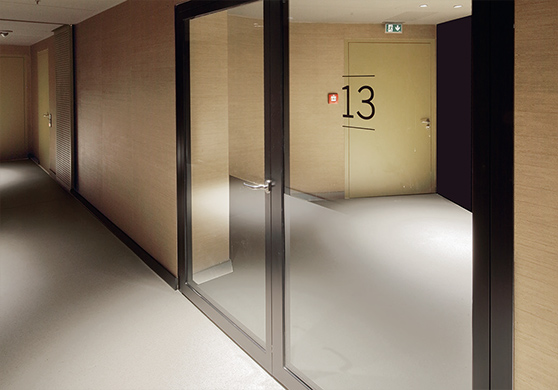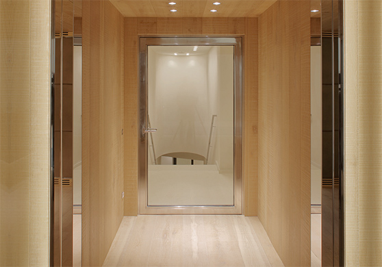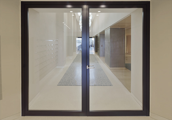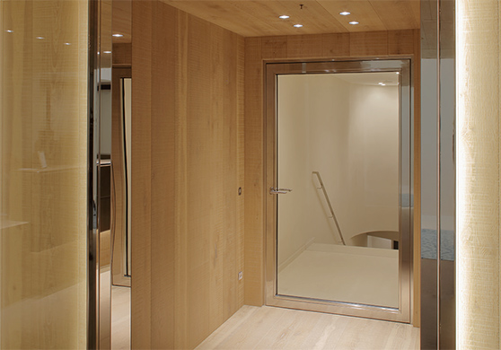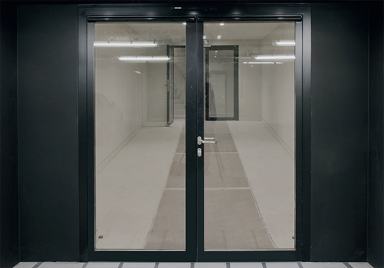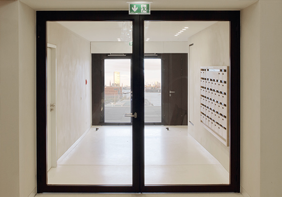 Zatímco protipožární dveře z nerezové oceli jsou vyhrazeny pro foyer, černě lakované dveře s trubkovým rámem se nacházejí na plochých podlažích na přechodu z výtahových vestibulů do přístupových chodeb.