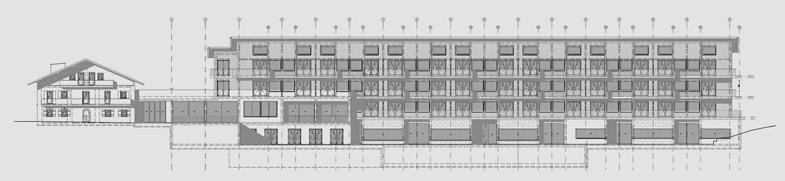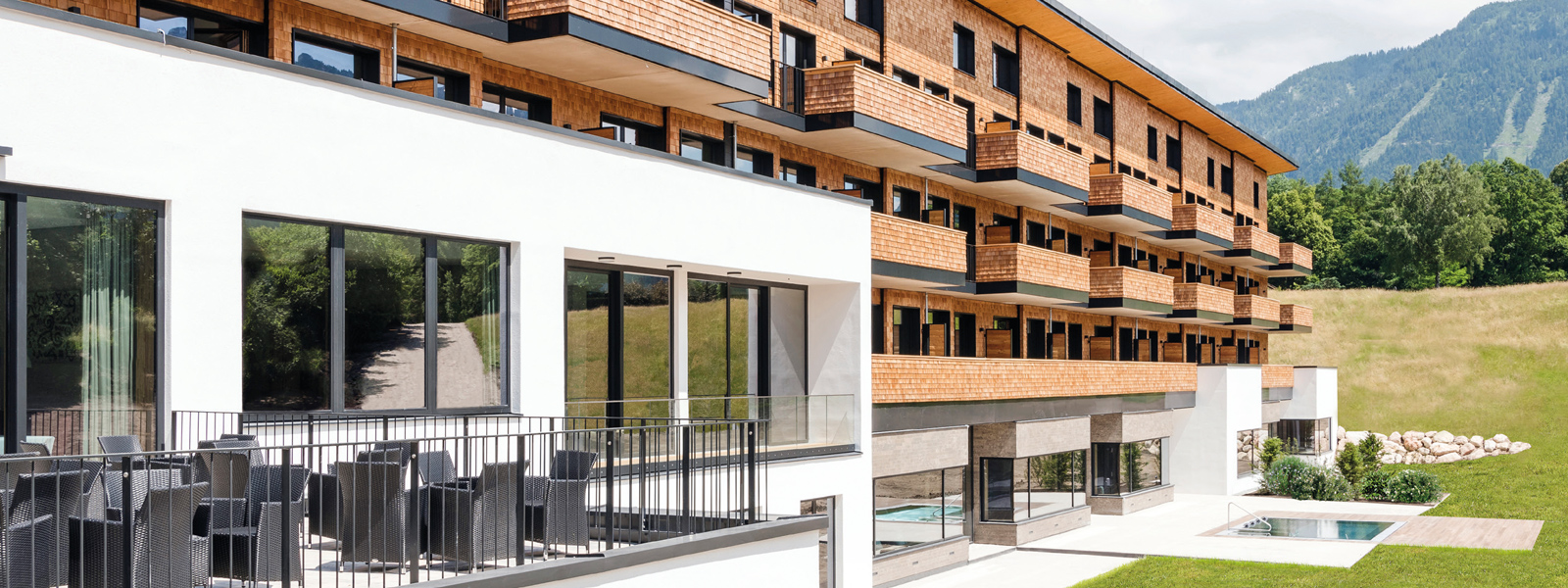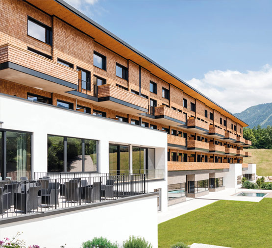 Za pouhých 16 měsíců výstavby byl Klosterhof rozšířen na multifunkční hotel a lázně nejvyšší kategorie. Mnichovský architekt Wolfgang Scherer vytvořil z resortu architektonický skvost, který díky použití místních materiálů ladí s alpskou krajinou. Současně jsou technologie a vybavení do posledního detailu na špičkové úrovni. To platí i pro stavební protipožární ochranu a nezbytné vybavení.