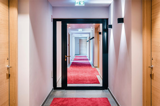 Elektronický uzamykací systém byl zajištěn na stavbě a dveře Novoferm byly doplněny tímto inteligentním systémem řízení přístupu. Dveře Novoferm z řad NovoFire® a NovoPorta Premio najdete v celém hotelu.