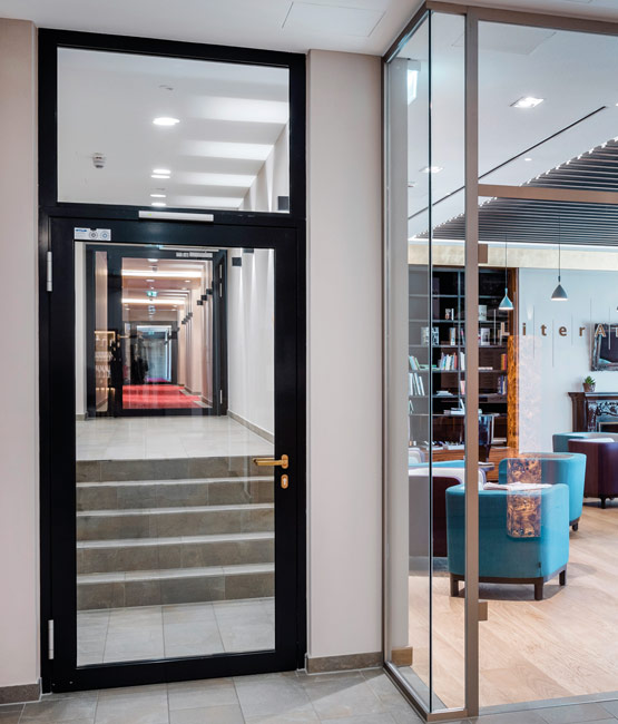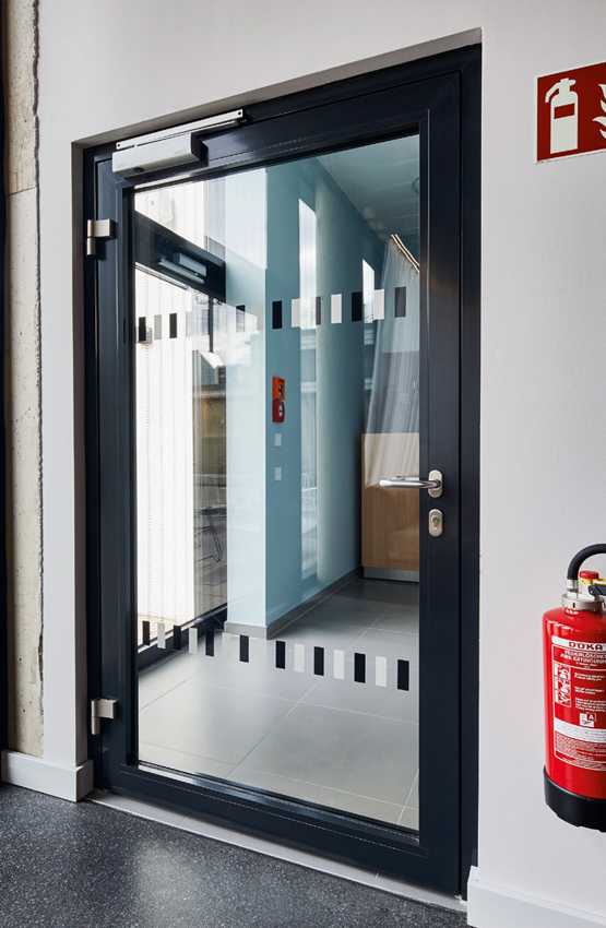 Kromě pevného zasklení a dveří s trubkovým rámem z hliníku - od T0 do T90 RS - byly použity také plechové dveře ze systému NovoPorta Premio. Ty poskytují spolehlivou protipožární a protihlukovou ochranu funkčních prostor s odpovídající elegancí.