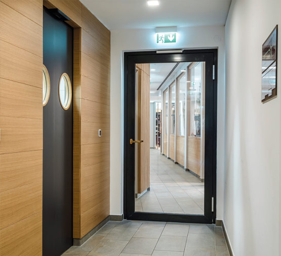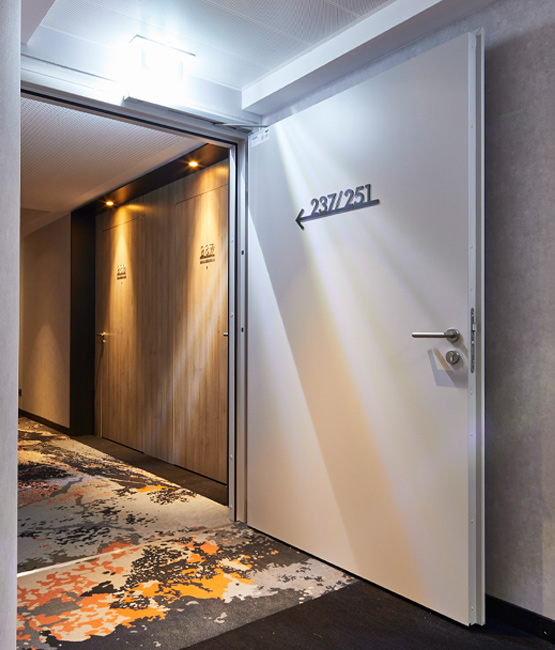 Na chodbách, včetně přístupu z podzemního parkoviště k výtahům, byly použity dveře NovoFire® T30 se skleněnými výplněmi. Dveře s trubkovým rámem a výplní z panelů v prostorách, kterými musí procházet zaměstnanci hotelu, nikoli hosté, byly speciálně vybaveny únikovými otvírači a systémem řízení únikových cest na místě.