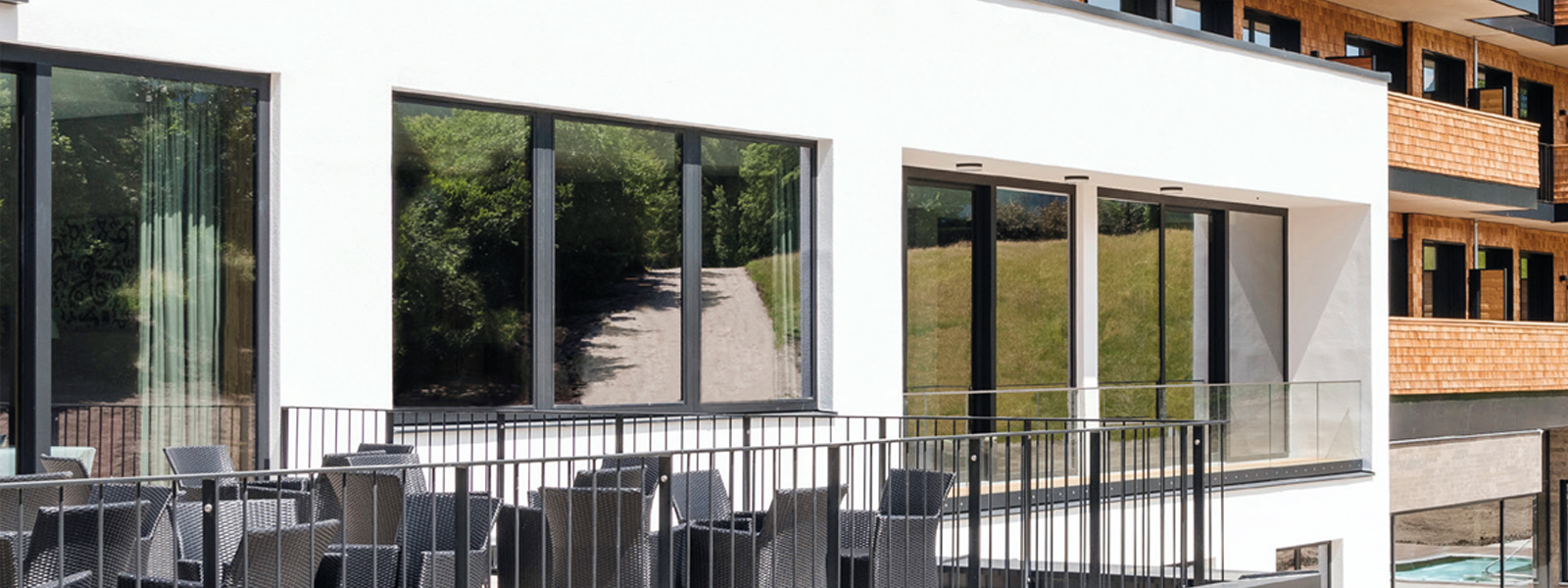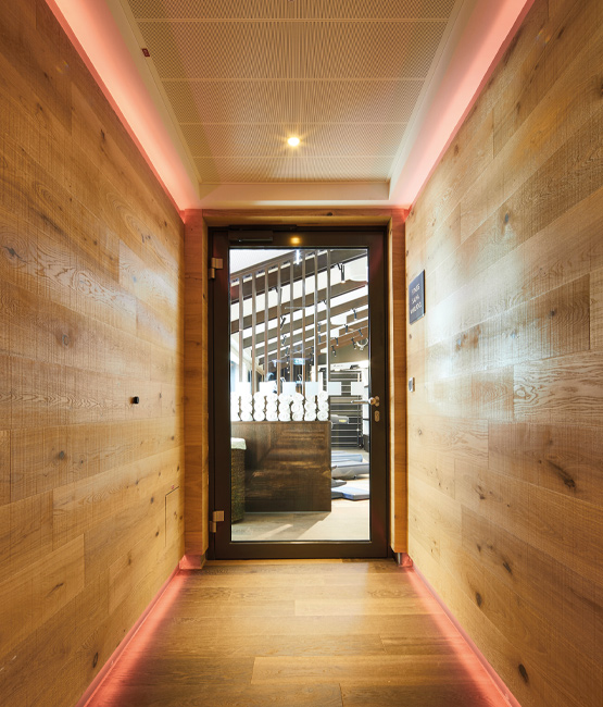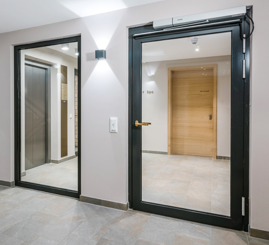 Wolfgang Scherer se pro dveře s trubkovým rámem rozhodl pro hliníkové profily od společnosti Novoferm. Zatímco jiní architekti dávají přednost poněkud štíhlejším ocelovým profilům, pro Scherera bylo rozhodujícím faktorem "lepší barevné pojetí" hliníkových řešení. Proč je toto sladění do posledního detailu důležité pro působení 4hvězdičkového+ resortu, mohou návštěvníci vidět, když se k budově blíží a procházejí jí. Ať už prostřednictvím šindelem obložené fasády, odstínů různých dřevin v interiéru, koberců, světel nebo uměleckých děl, všude je pohled hostů upoután soudržným a harmonickým barevným konceptem. Ten vyžaduje transparentnost a nepřipouští žádné estetické kompromisy, proto hrají důležitou roli povrchy protipožárních dveří, které jsou přizpůsobeny působení místnosti.