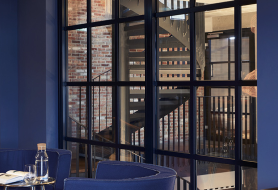 Kromě toho jsou dveře do holičství - stejně jako vchod do baru "De Baar" v cateringové zóně a dveře do dalších prostor, které nejsou běžně přístupné - vybaveny digitální kontrolou vstupu. To platí i zde: Práškově lakované hliníkové trubkové rámy od společnosti Novoferm umožňují vytvořit elegantní a vytříbenou atmosféru baru a restaurace.