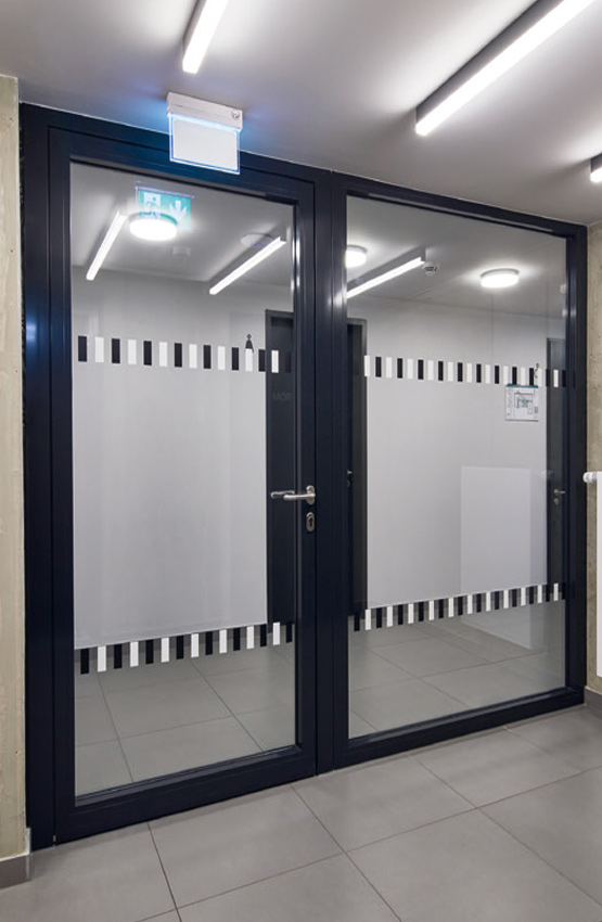 To byl také požadavek na dveře a pevné zasklení rozdělující místnosti od společnosti Novoferm, pro které byl proto zvolen elegantní tmavý práškový lak.
