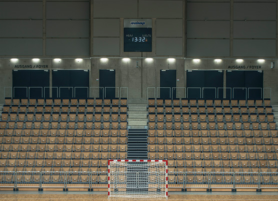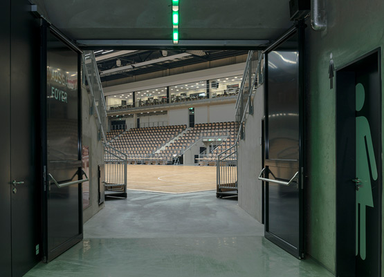S podlahovou plochou 5 500 m² nabízí mnohostranné možnosti využití. Jeviště lze libovolně umístit a přizpůsobit jeho velikost podle potřeby. LED pásky umístěné pod konzolovou střechou a pasoucí se světlo na fasádě dodávají sálu ve tmě zářivý vzhled.